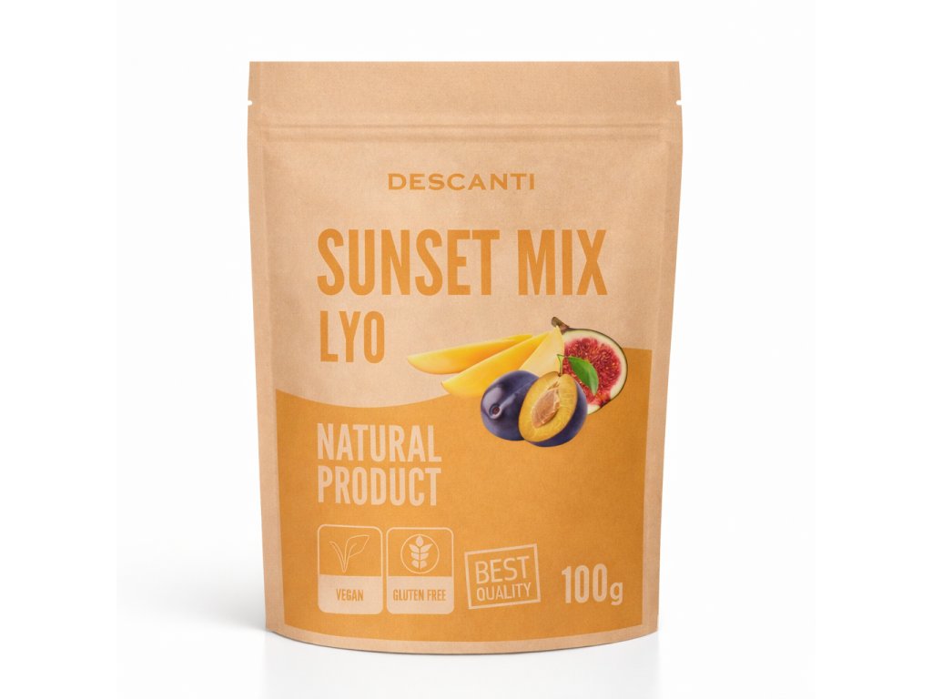 Objavte chuť slnkom dozretého ovocia v praktickej a výživnej podobe. Mrazom sušený mix ovocia SUNSET je kombináciou fíg (30 %), manga (30 %) a sliviek (40 %), ktoré si vďaka šetrnému procesu lyofilizácie zachovávajú svoju prirodzenú chuť, farbu aj nutričné hodnoty.